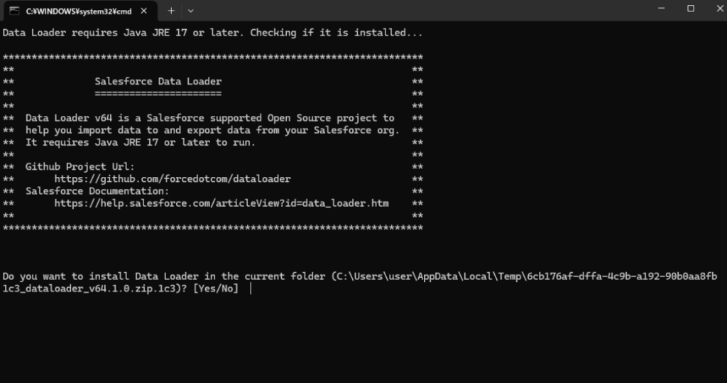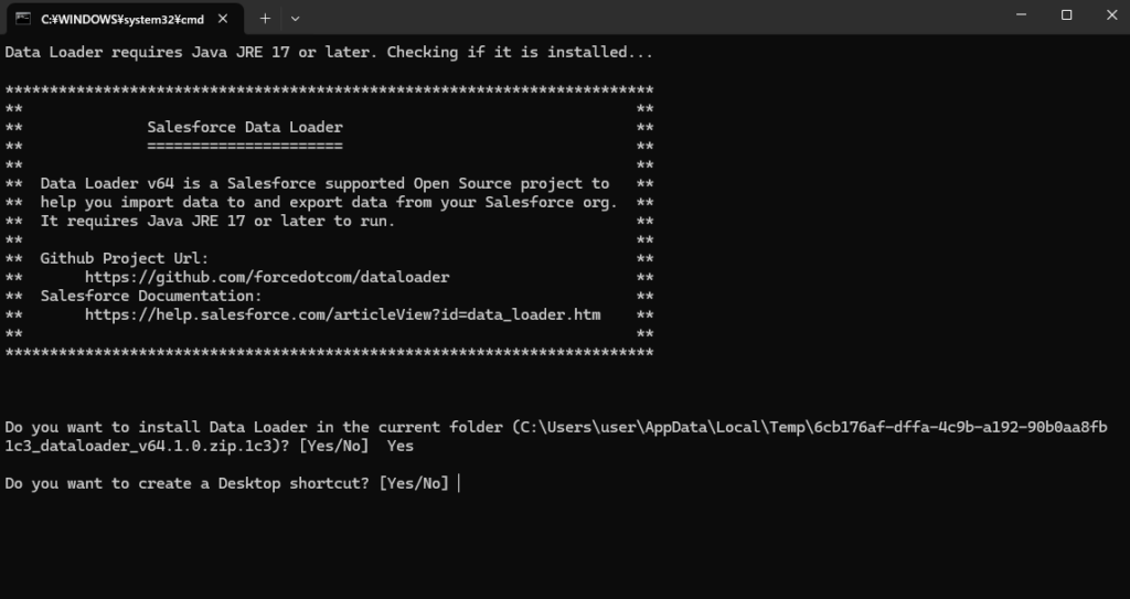 Dataloaderのインストール先を表示されているフォルダにする場合はYes、それ以外の場合はNoを入力(今回はYesで進めます)