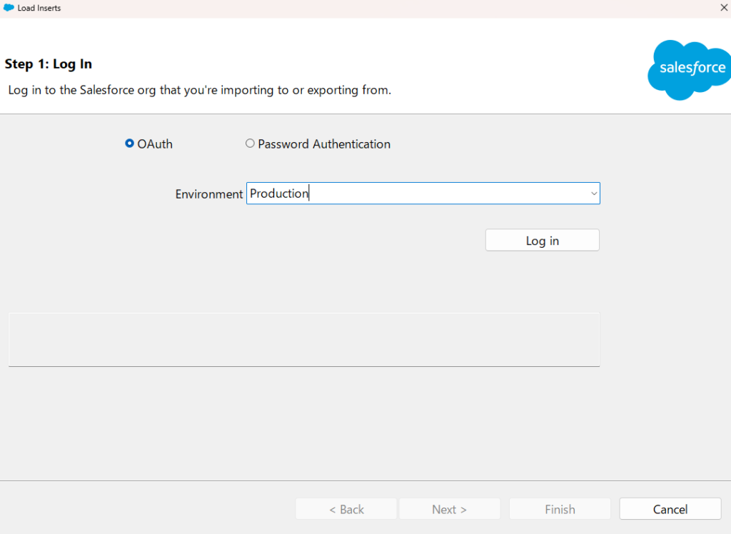 OAuth認証もしくはパスワード認証を選択し、インポートしたい環境がProductionかSandboxかを選択した後にLog inをクリックします。