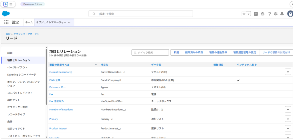 リードに新規レコードを挿入するため、リードオブジェクトを構成している項目を確認します。