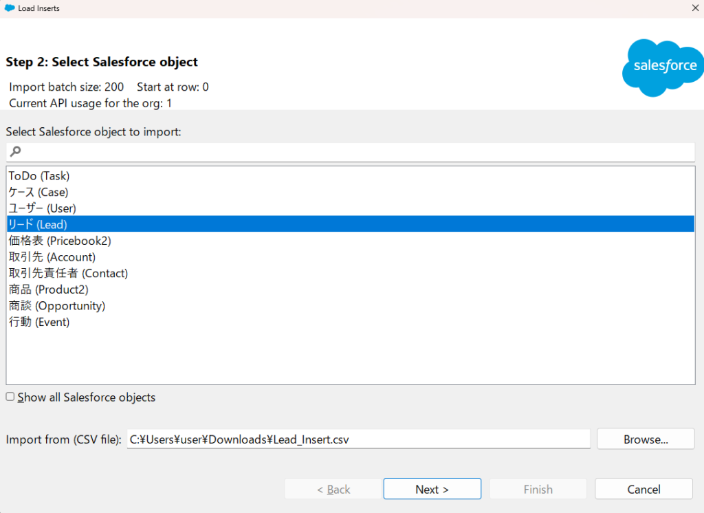 例えば、csvの列「姓」にはSalesforceの項目「LastName」に対応しているという見方になります。