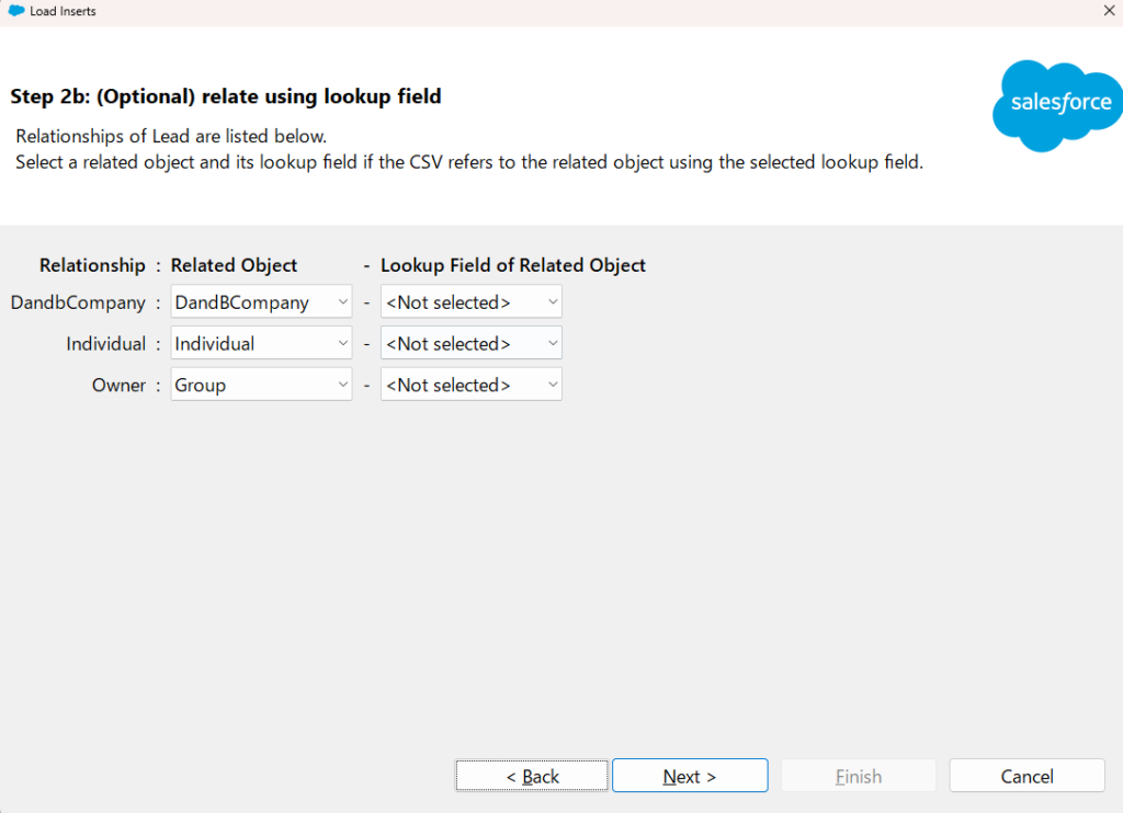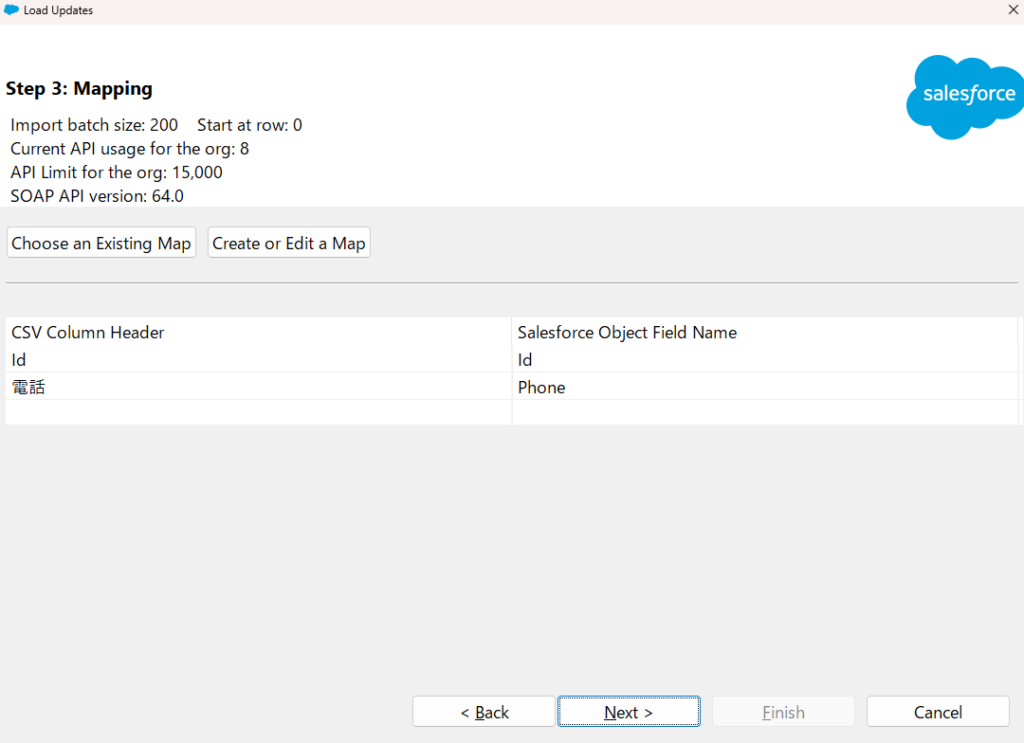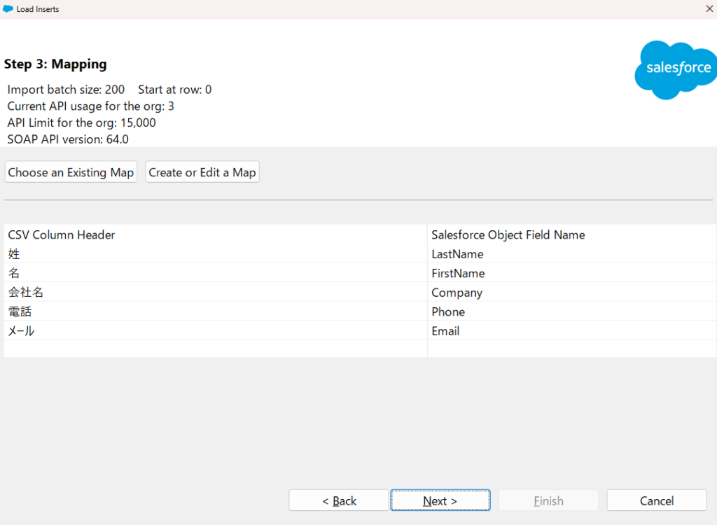 以下のような画面になり、「CSV Column Header」と「Salesforce Object Field Name」という列が表示されています。