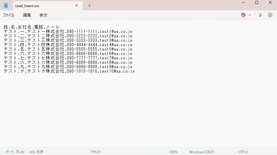 項目を確認した後、挿入したいレコードの情報をcsvにて作成します。