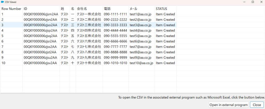 csvに記載していたレコードが新規レコードとして作成されたことが表示されます。
