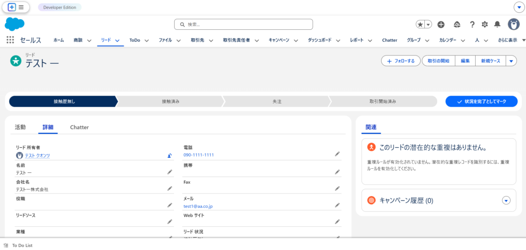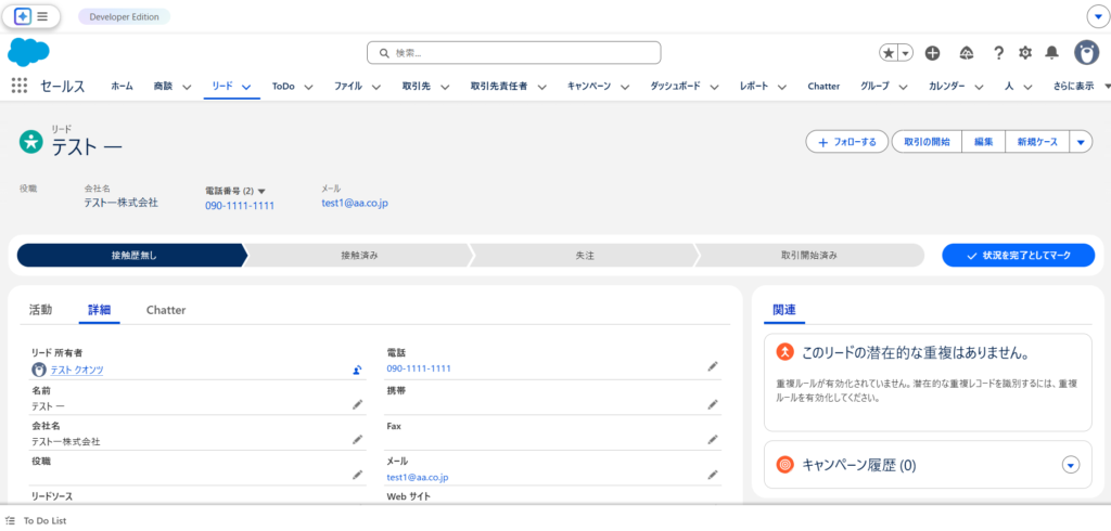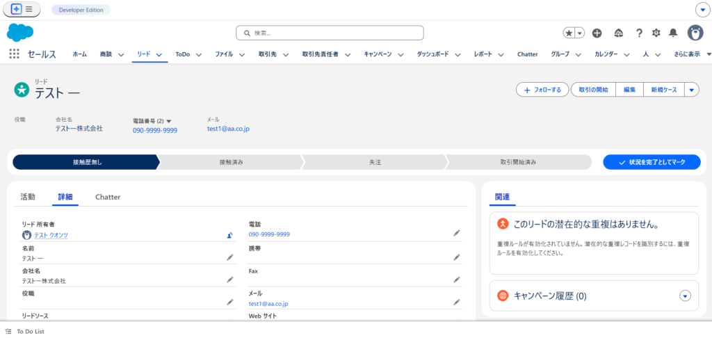 Salesforce上でも電話が「090-1111-1111」から「090-9999-9999」に変更されていることが確認できます。