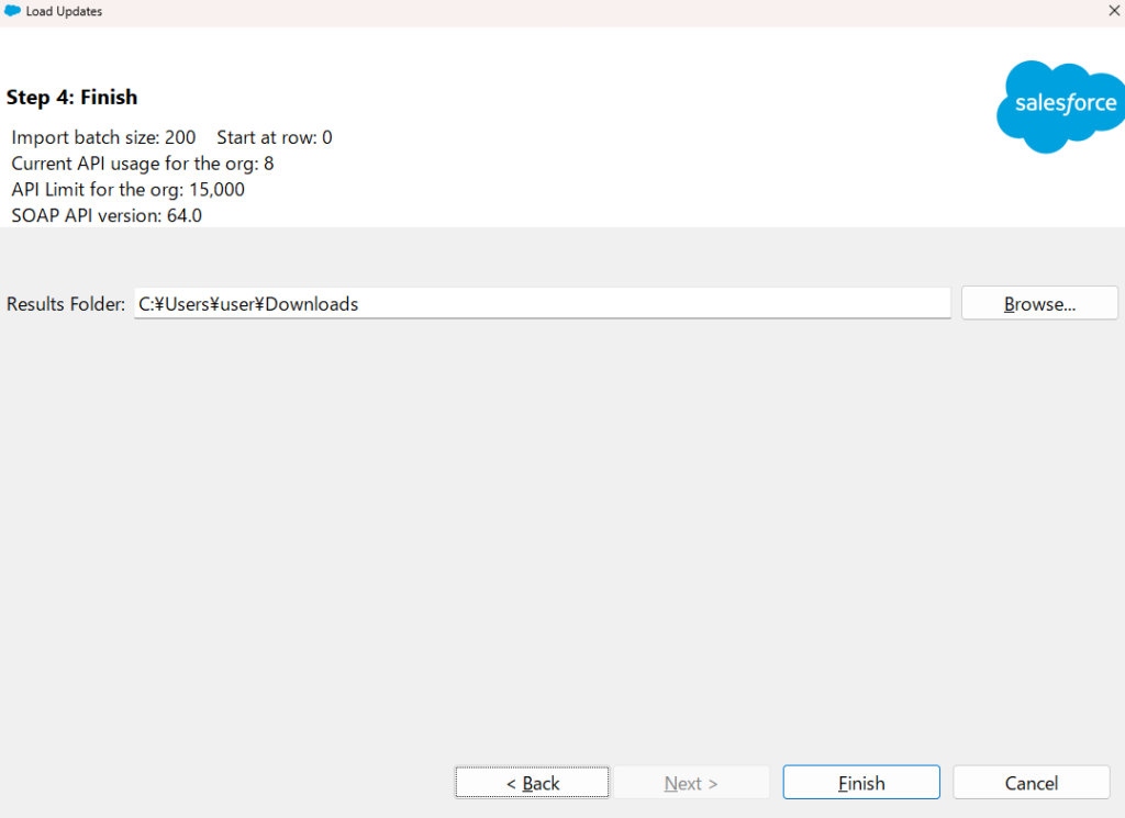 インポートの結果が記載されたcsvファイルをどこに出力するかを選択し、「Finish」をクリックします。
