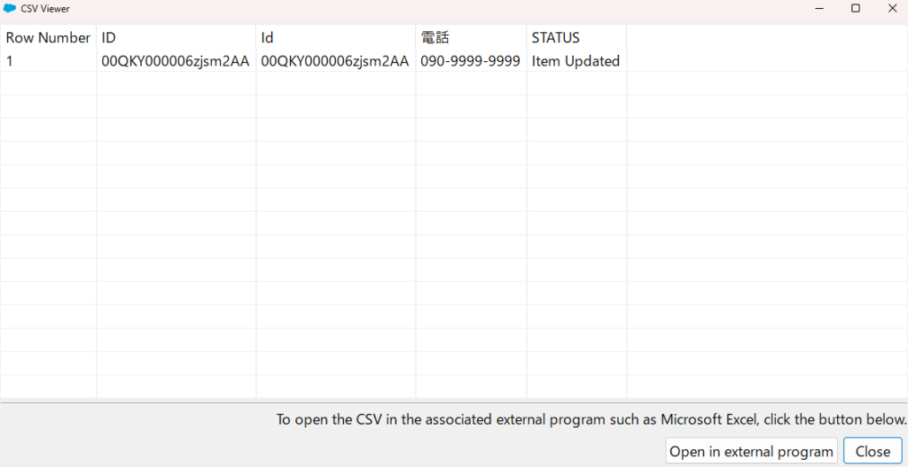 Update用のcsvは以下の通りです。IdはSalesforce上で管理されているレコードのIdを入力します。(URLで確認できます。https://xxxxxx/lightning/r/Lead/00QKY000006zjsm2AA/view ←太字の部分がIdです。)