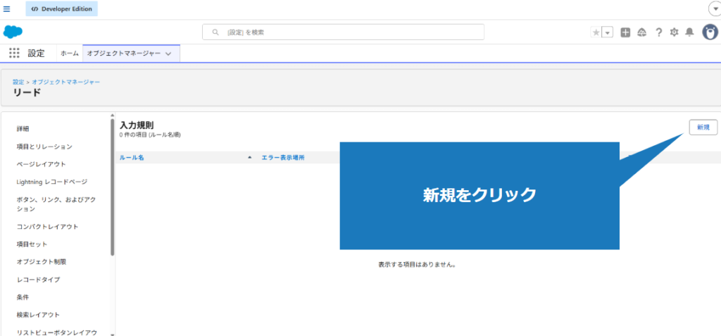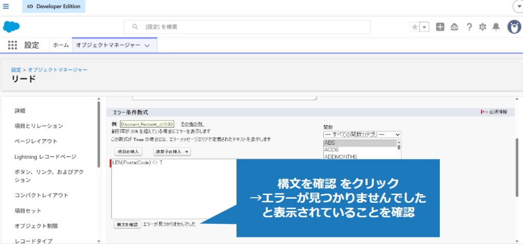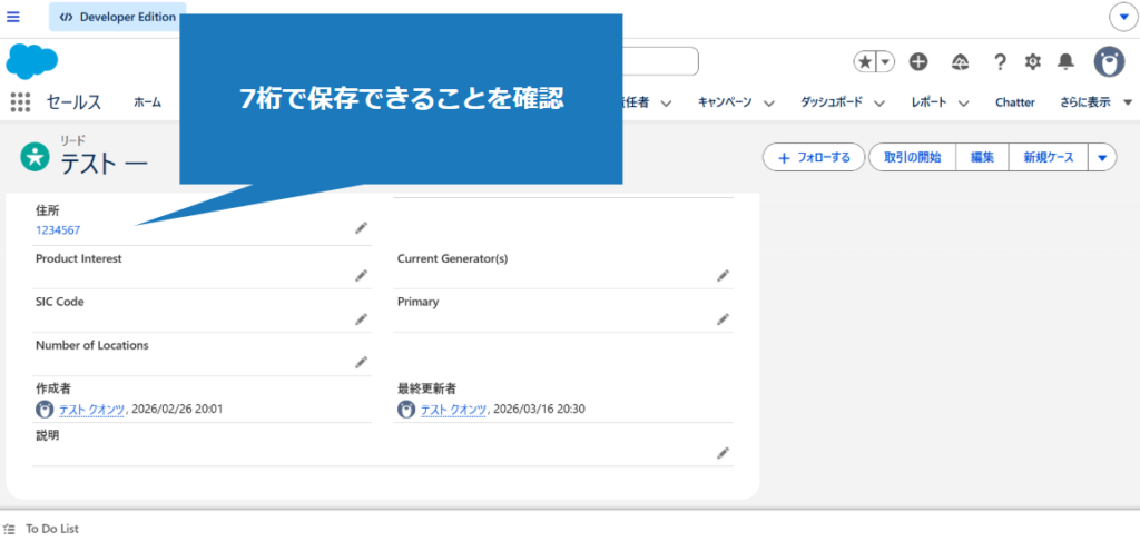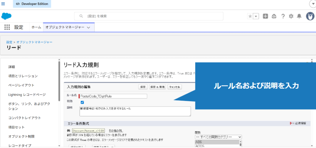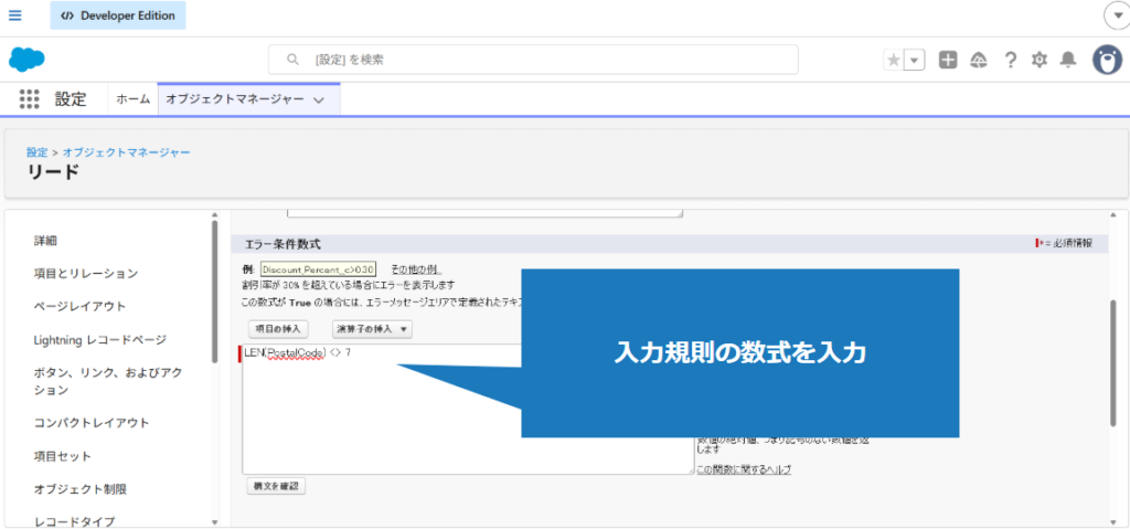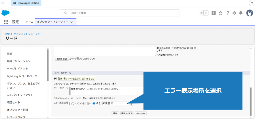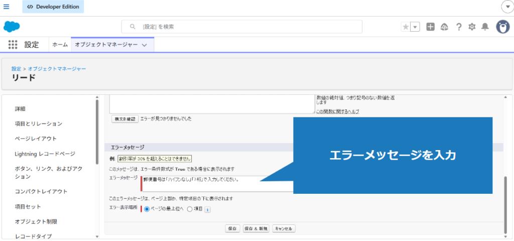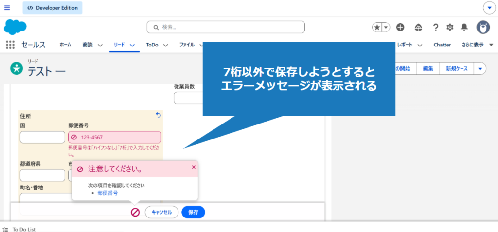 1.該当のオブジェクトの入力規則を適用した項目に、不正な値を入力(今回はリードの郵便番号項目)