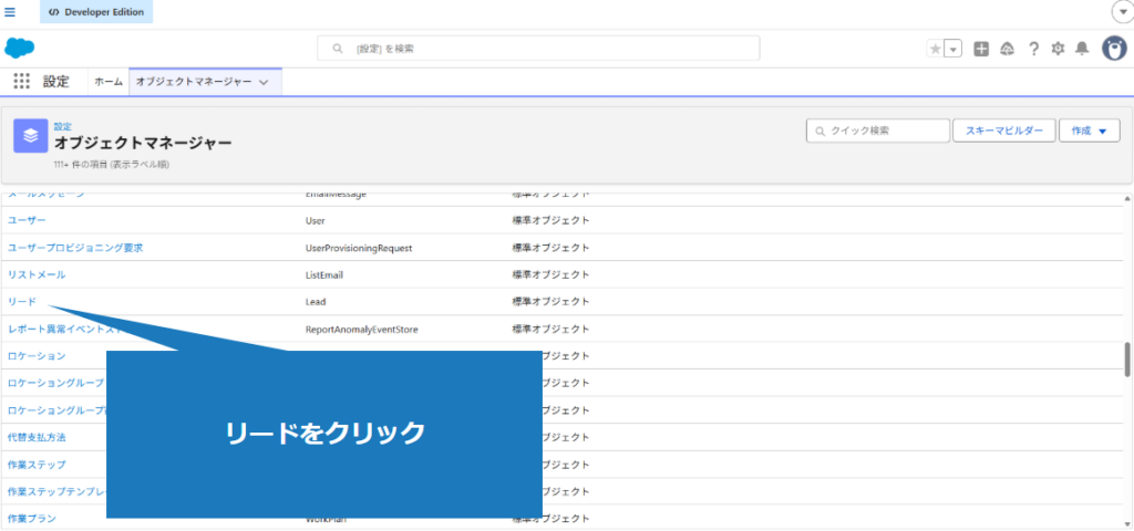 3.対象オブジェクト(例:リード)をクリック