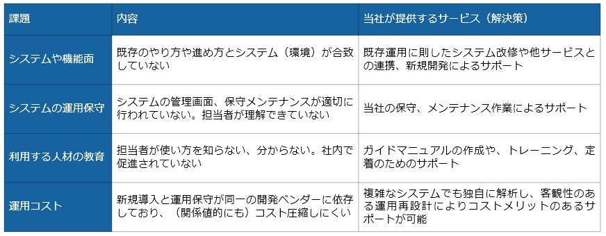 システムを新規導入した当初の社内システム担当者が不在になったり、 社内の引き継ぎがうまく行われず、メンテナンスが適切に行われていないケースでは、 当社が運用・保守作業を代行することで様々なリスクを回避することが可能です。